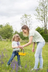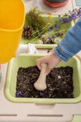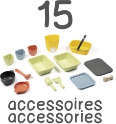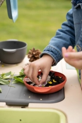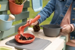 Sitko, koszyk, czerpak, grabki, łopatka i inne akcesoria inspirują do „gotowania” z błota, piasku i kwiatów oraz wspierają zabawę w grupie.