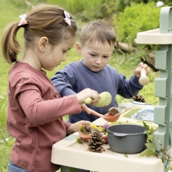 Ta wytrzymała zewnętrzna kuchnia w naturalnych kolorach oferuje dzieciom autentyczną przestrzeń do zabawy i eksperymentowania z wodą, piaskiem i materiałami naturalnymi. Wyjmowane boxy ułatwiają przenoszenie i sprzątanie, a kranik z obrotowym zaworem pomaga dozować wodę i rozwija małą motorykę.