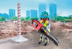 W zestawie 2 budowlańców w kaskach, krótkofalówka, miotła, łopata, statyw pomiarowy i inne narzędzia – do nieograniczonych scenariuszy i rozwoju kreatywności.