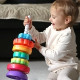 Budowanie wieży z pierścieni o różnej wielkości i kolorze rozwija logiczne myślenie i kreatywność.