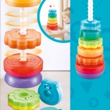 - Zestaw zawiera sześć pierścieni o różnych kształtach, które można układać jeden na drugim, tworząc kolorową, obracającą się piramidę
