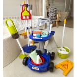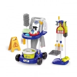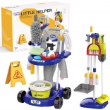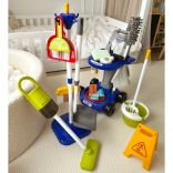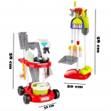 Zawiera 29 części, w tym wózek, mop, zmiotkę, szufelkę i inne akcesoria do sprzątania.