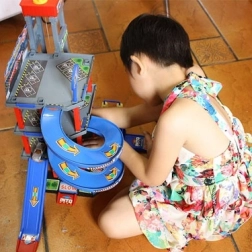Długie, kręte zjazdy pozwalają autkom szybko i płynnie przemieszczać się między piętrami. Świetne połączenie szybkości, zręczności i zabawy dla małych kierowców.