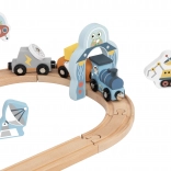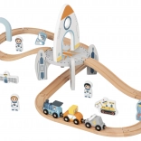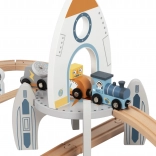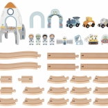 Ta drewniana kosmiczna kolejka wciąga dzieci w świat kosmosu dzięki tematycznym elementom, takim jak figurki astronautów, sonda kosmiczna, łazik i latający talerz. Wielopoziomowe ułożenie torów nadaje zabawie dynamiki. Centralnym elementem zestawu jest duża kosmiczna rakieta, która pełni funkcję dekoracyjną i konstrukcyjną.