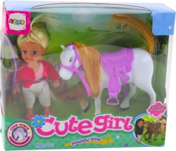 Zawartość opakowania: mini laleczka w stroju jeździeckim, biały koń z długą grzywą i ogonem, fioletowe siodło i uzda, bat jeździecki.