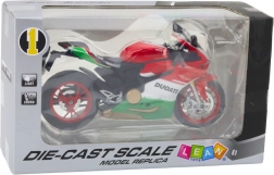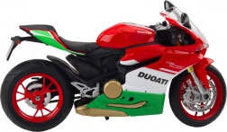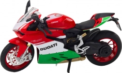 Metalowy model z trójkolorowym wzornictwem (czerwony, biały, zielony), inspirowanym włoskimi motocyklami wyścigowymi, wyróżnia się autentycznością.