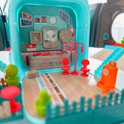 Zestaw zawiera figurkę lekarza, psich przyjaciół, meble i wyposażenie kliniki oraz narzędzia lekarskie (stetoskop, strzykawkę itp.), a także grzebień, nożyczki i inne dodatki do pielęgnacji. Całość jest lekka, poręczna i łatwa w przenoszeniu – idealna w podróży i do pokoju dziecięcego.