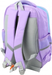 Fioletowy szkolny plecak z kolorowymi naszywkami w kształcie zamka, jednorożca i serca. Łączy funkcjonalność i baśniowy styl, idealny dla każdej małej uczennicy. Wykonany z odpornego materiału do codziennego użytku.