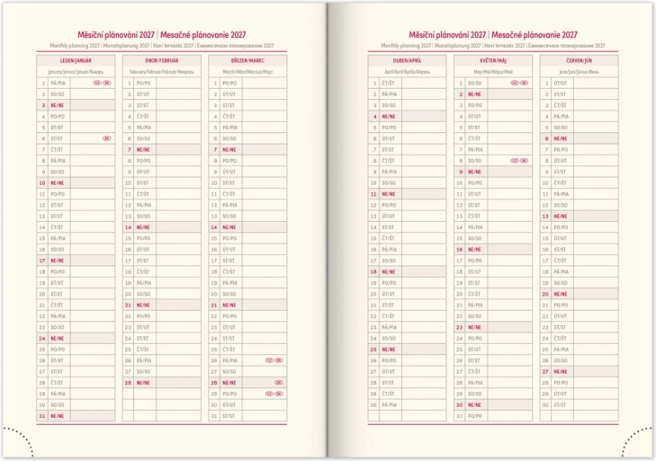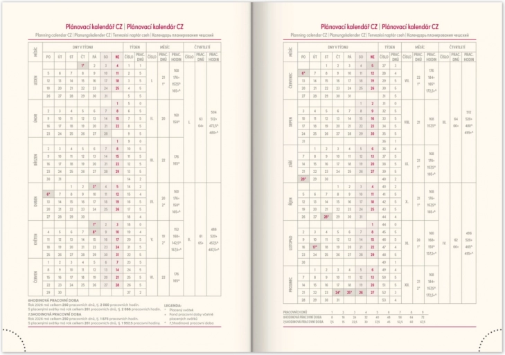 Nowoczesny i elegancki terminarz z tygodniowym układem w kalendarzu czesko-słowackim. Wyposażony w solidną gumkę i uchwyt na długopis.