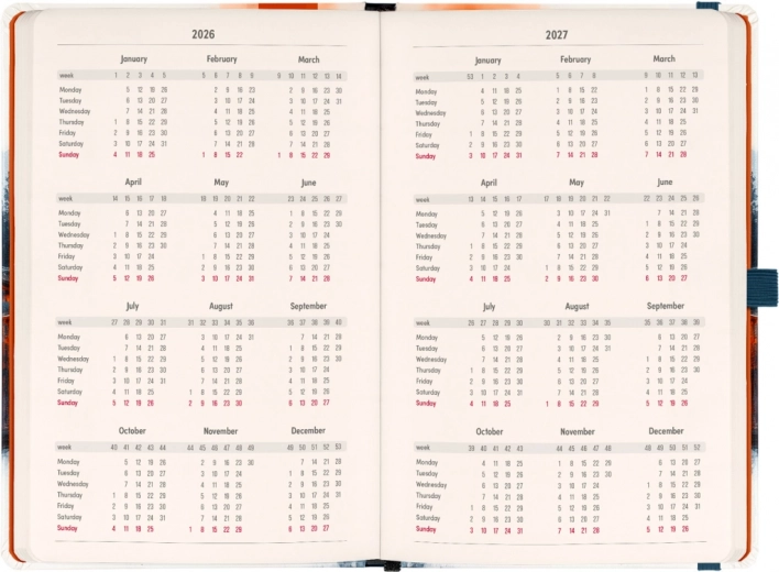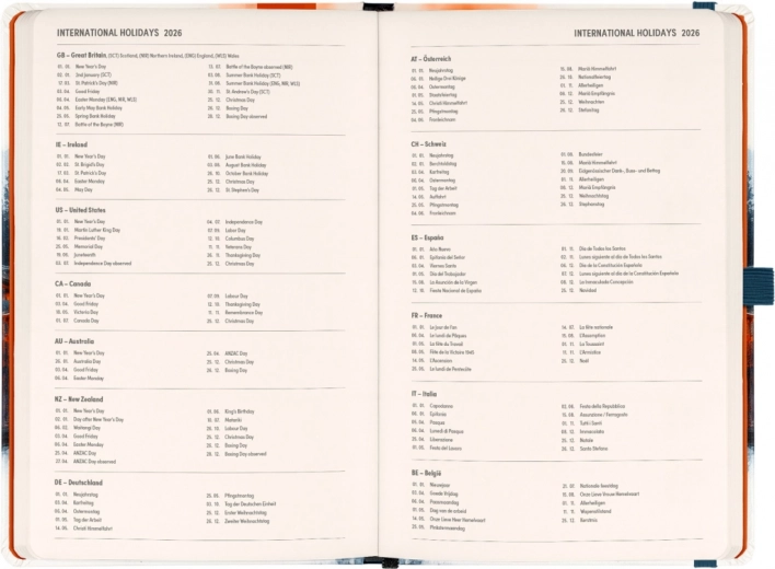 - Część kalendarza: Dwutygodniowe horyzontalne kalendarium z międzynarodowymi świętami.