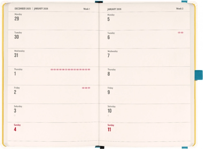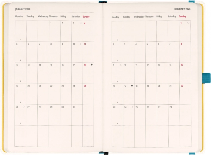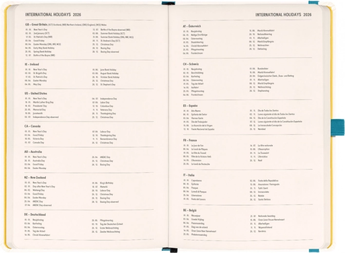 NOTIQUE Planbook Zielnik 2026 to doskonałe połączenie kalendarza i notesu w jednym. Pierwsza połowa oferuje dwutygodniowe horyzontalne kalendarium z międzynarodowymi świętami, co umożliwia efektywne planowanie każdego tygodnia. Druga połowa zawiera strony w linie, idealne na Twoje notatki, szkice lub planowanie projektów.