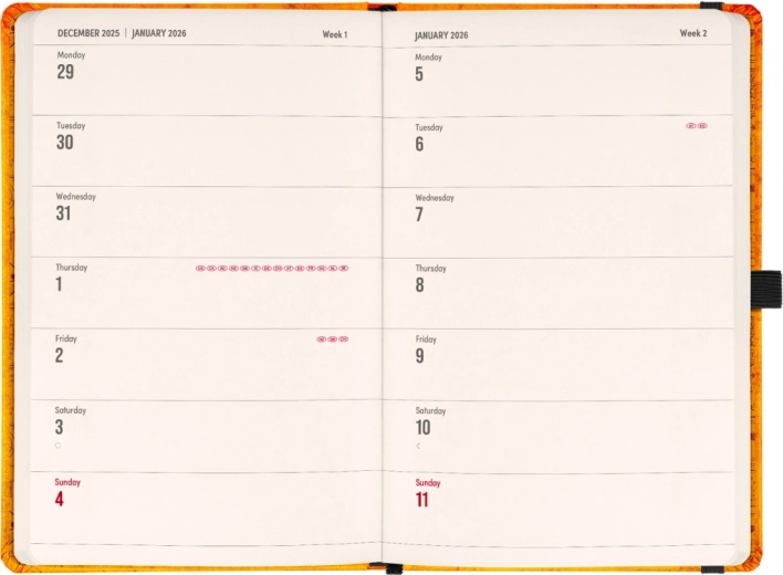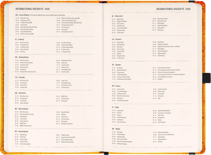 - Pierwsza połowa zawiera dwutygodniowe, horyzontalne kalendarium z międzynarodowymi świętami.