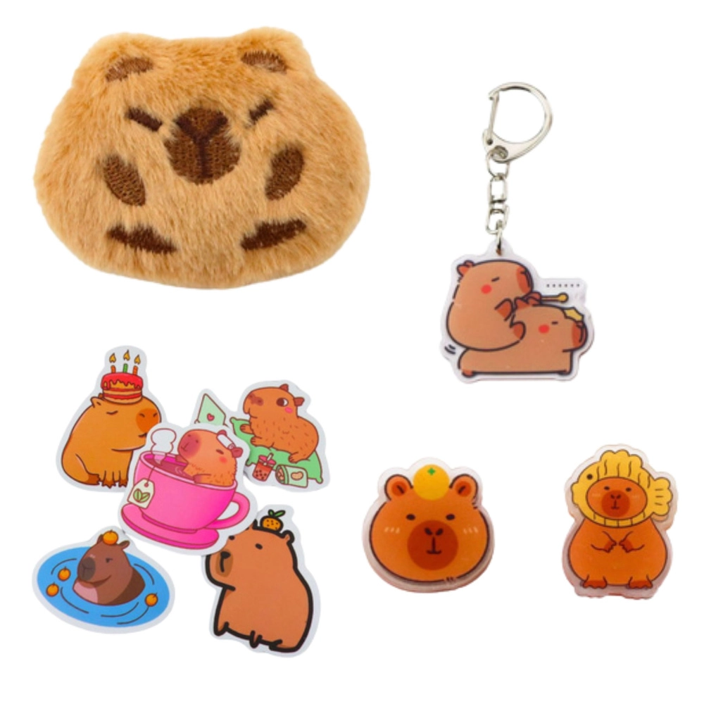 Zestaw zawiera bogaty komplet dodatków z motywem kapibary, w tym: 4 długopisy z czarnym tuszem, 6 myszek-korektorów, 4 komplety dekoracyjnych karteczek samoprzylepnych, pluszową kapibarę z broszką, brelok z kapibarą, 2 spinki z kapibarą oraz 5 zabawnych naklejek. Produkt jest idealnym prezentem dla uczniów, miłośników zwierząt lub każdego, kto kocha unikalne dodatki do nauki.