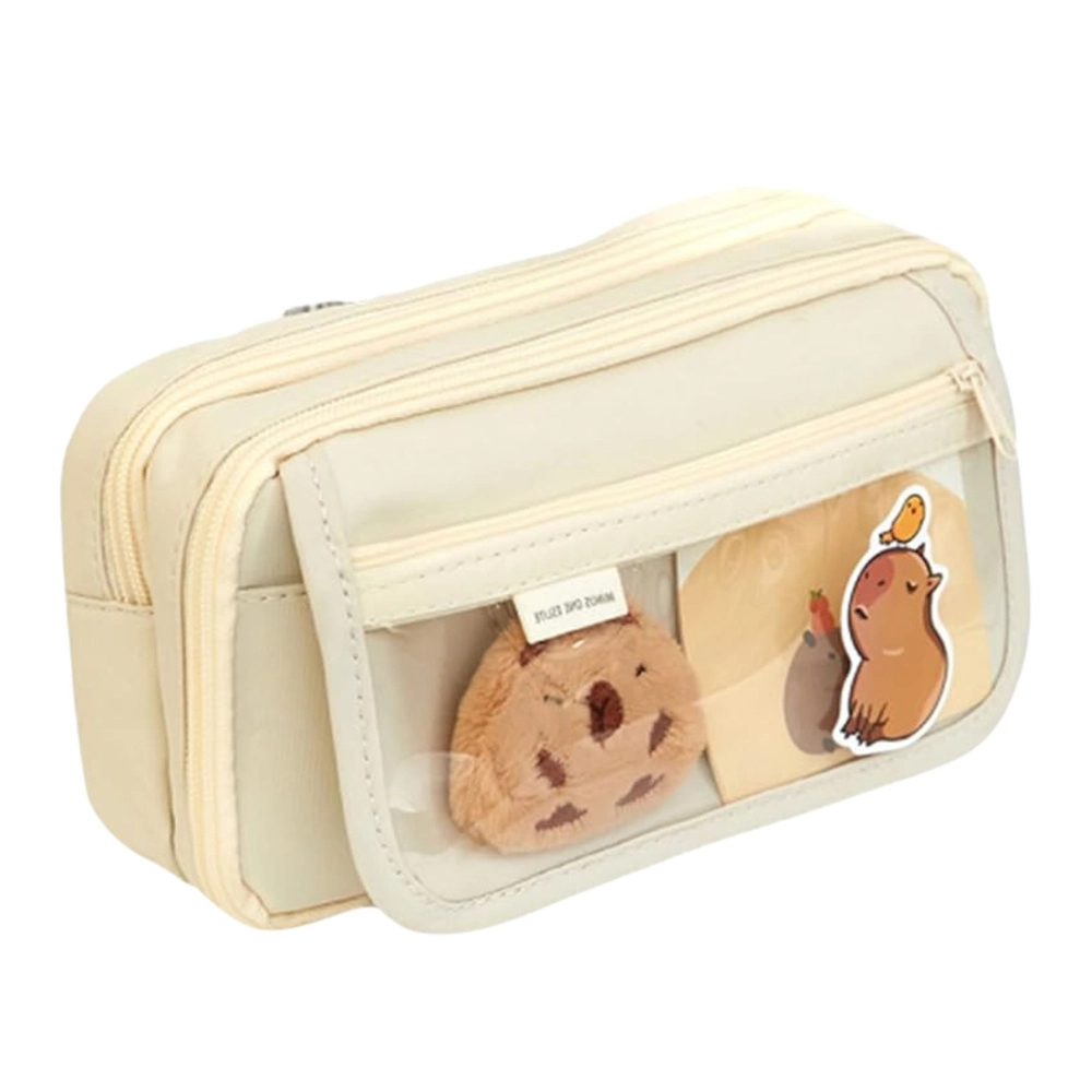 Beżowy piórnik z motywami kapibary to nie tylko praktyczny organizer, lecz także czarujący zestaw kreatywnych akcesoriów, który zachwyci każdego fana artykułów papierniczych. Ma dwie przestronne komory, z których jedna jest wyposażona w siateczkowe separatory dla wygodnej organizacji przyborów do pisania. Na przedniej stronie znajdują się dwie zewnętrzne kieszenie, w tym jedna przezroczysta, idealna na dekoracje, przypinki lub pocztówki.