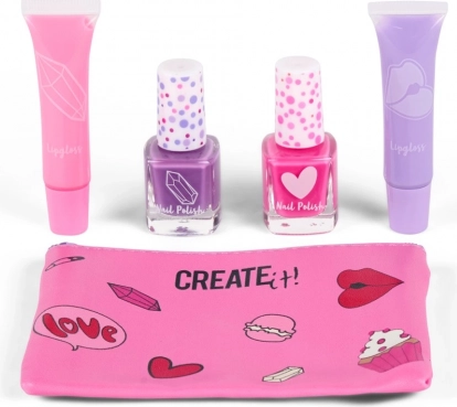 - Kompletny zestaw na pierwszy makijaż: 2× błyszczyk do ust, 2× lakier do paznokci, kosmetyczka.