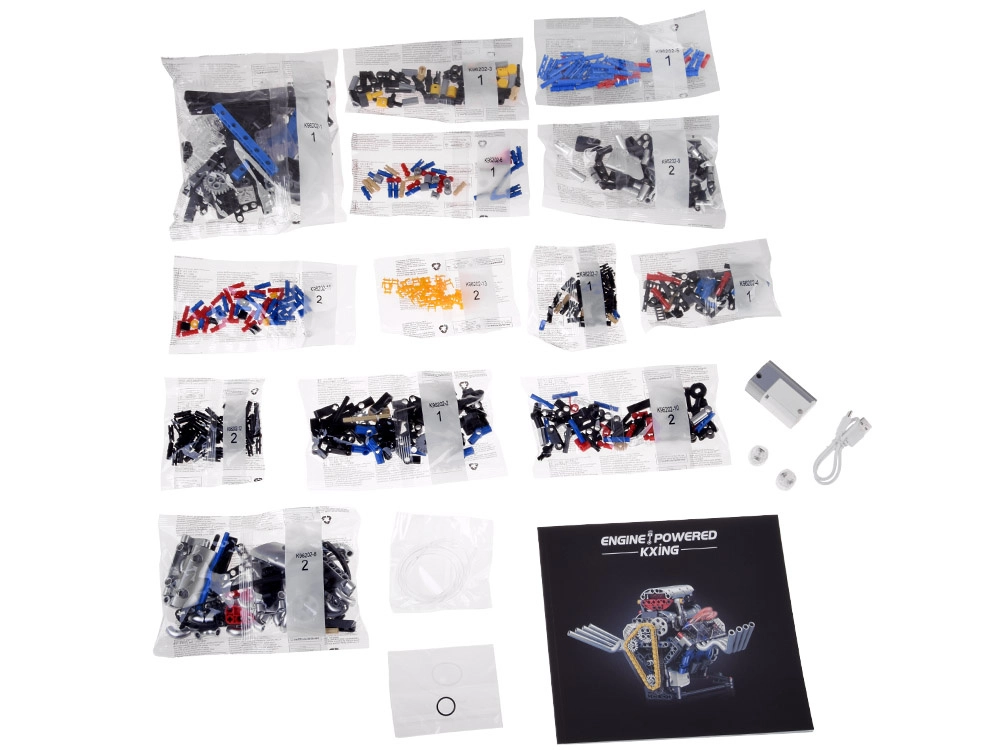 W zestawie znajdują się ponumerowane woreczki ułatwiające orientację, kabel USB do ładowania oraz przejrzysta instrukcja obrazkowa. Efektowne czerwone światło nadaje modelowi imponujący wygląd i podkreśla ruchome części.