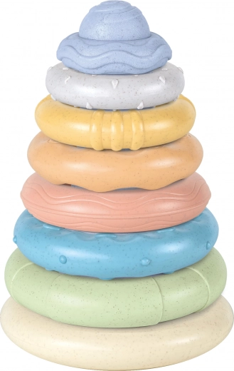 Ta klasyczna zabawka edukacyjna wspiera prawidłowy rozwój dziecka w formie zabawy. Dzięki różnym rozmiarom kółek dzieci uczą się rozpoznawania kolejności, kolorów oraz trenują chwyt. Wieża jest lekka, wytrzymała i idealna do codziennej zabawy w domu i w podróży.