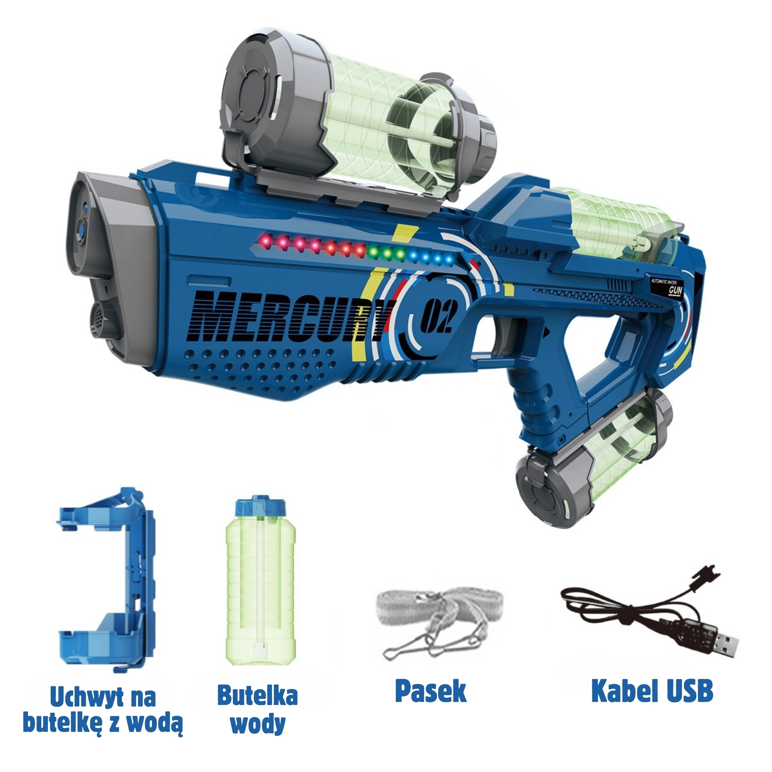 - pistolet na wodę MERCURY 02, 3 zbiorniki, kabel USB, pasek na ramię, instrukcja