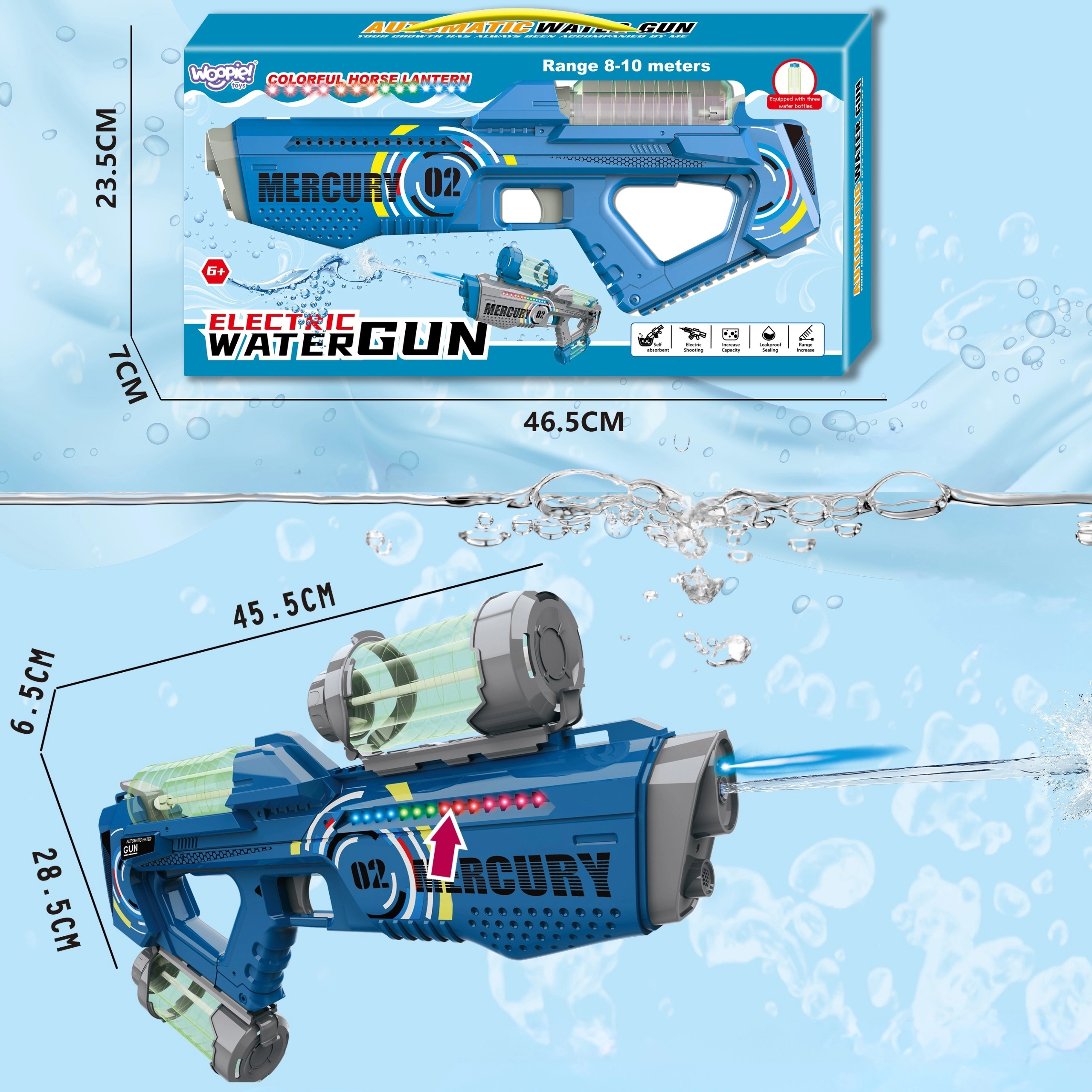 Ciesz się latem w pełni z elektrycznym pistoletem na wodę WOOPIE MERCURY 02! Oferuje automatyczne strzelanie bez pompowania, wydajny akumulator 2200 mAh, 3 wymienne zbiorniki na wodę oraz ładowanie USB. Świetny wybór dla dzieci od 6 lat i dorosłych – do ogrodu, nad wodę i na dziecięce bitwy.