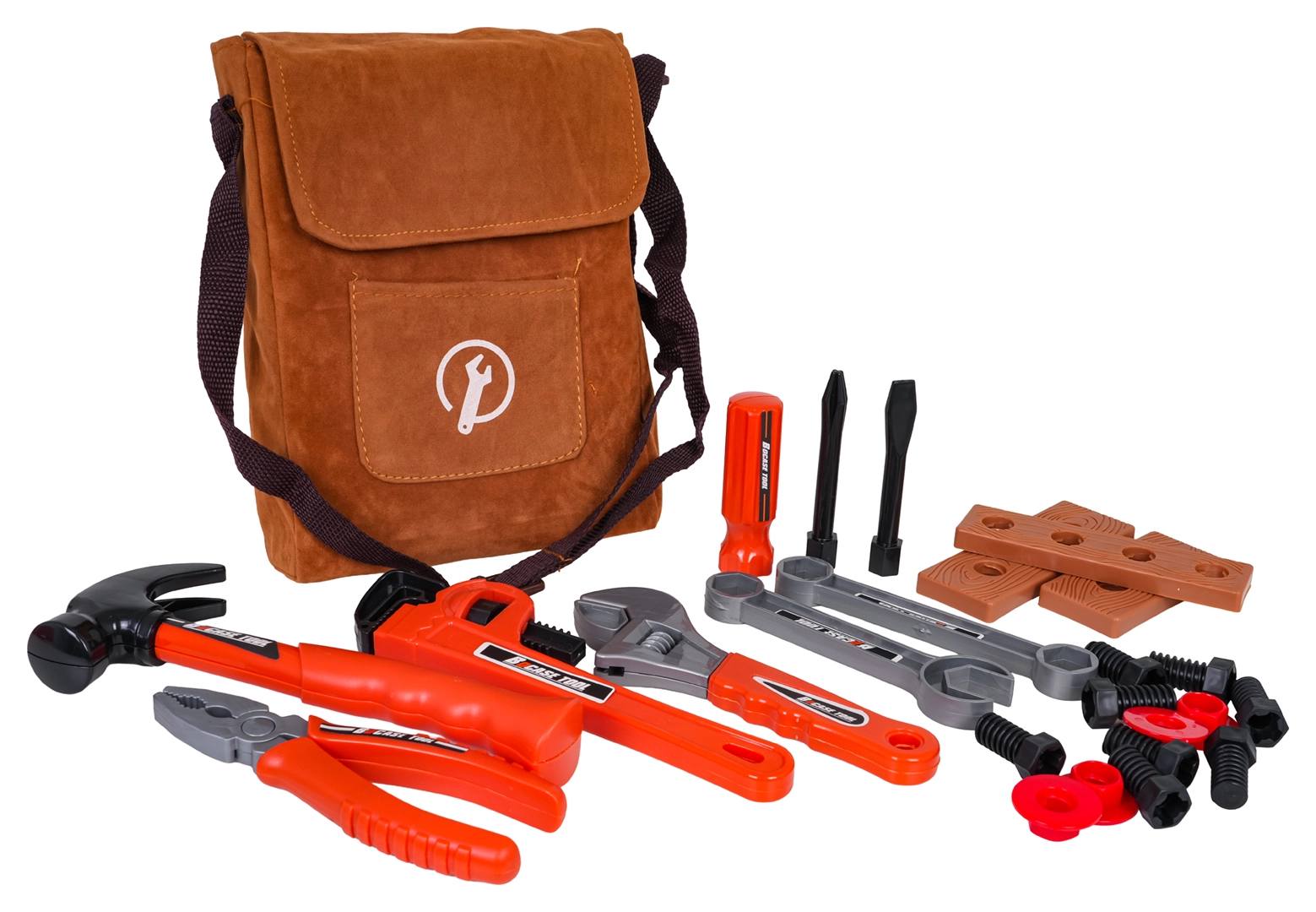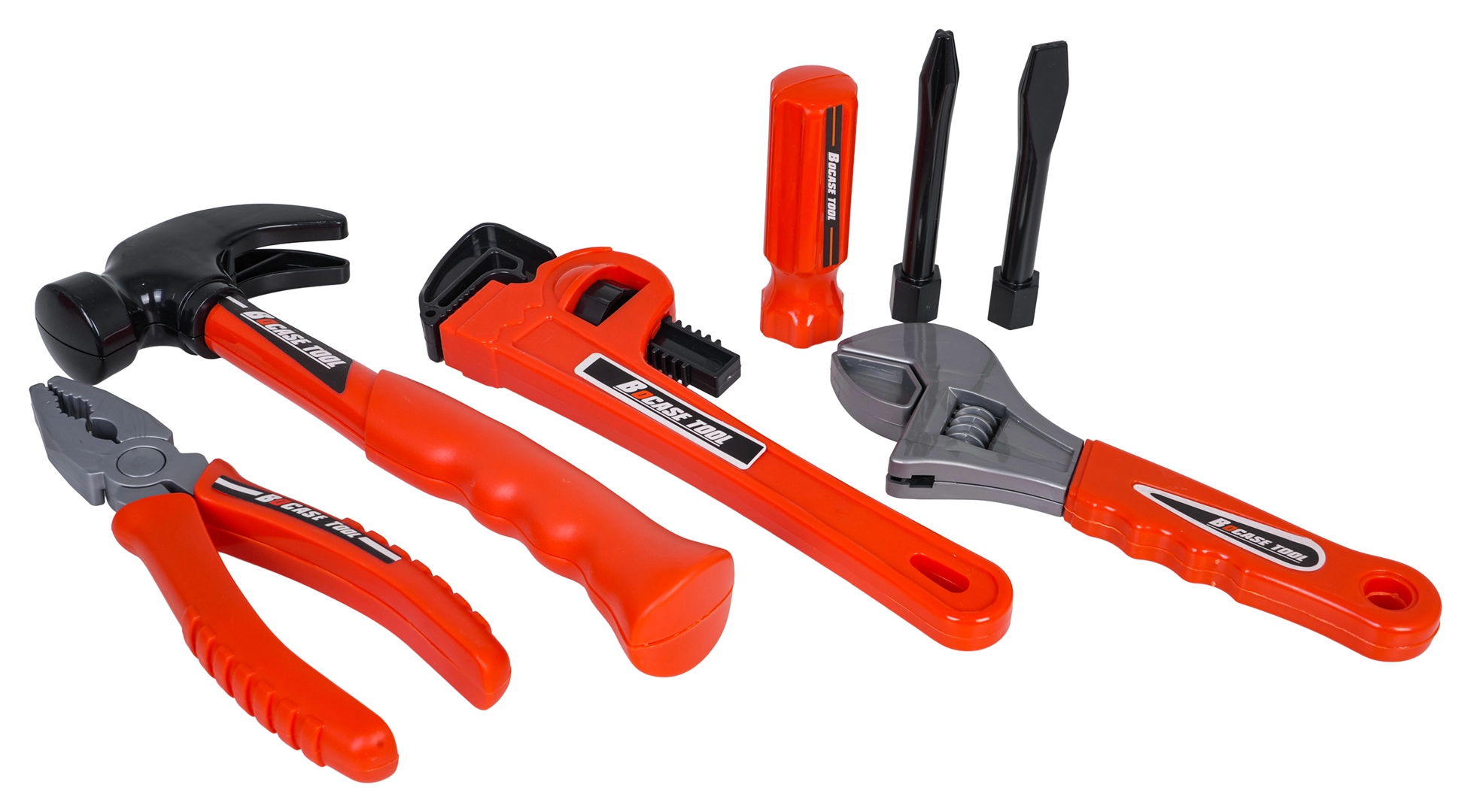 Młotek, szczypce, klucz nastawny, śrubokręt z bitami oraz klucz do rur wyglądają jak prawdziwe, ale są lekkie i bezpieczne dla dziecięcych rąk.