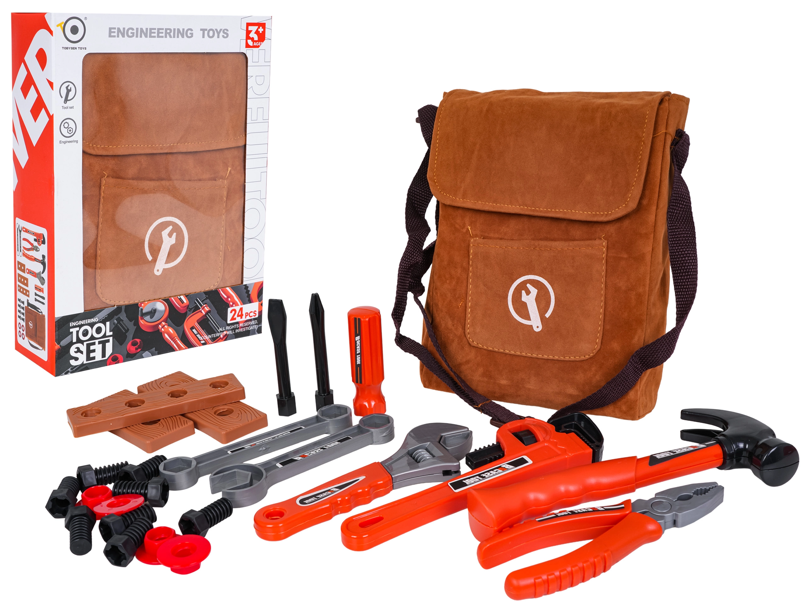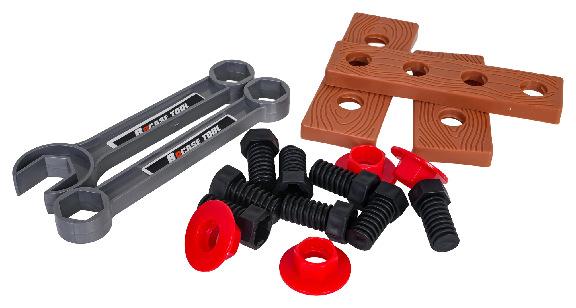 W opakowaniu znajdziesz wszystko, co potrzebne: młotek, szczypce, klucz do rur, klucz nastawny, śrubokręt z wymiennymi bitami, śruby, nakrętki oraz „drewniane” listwy z otworami do ćwiczeń. Elementy zaprojektowano z myślą o małych dziecięcych dłoniach, z naciskiem na wygodny chwyt i bezpieczne użytkowanie.