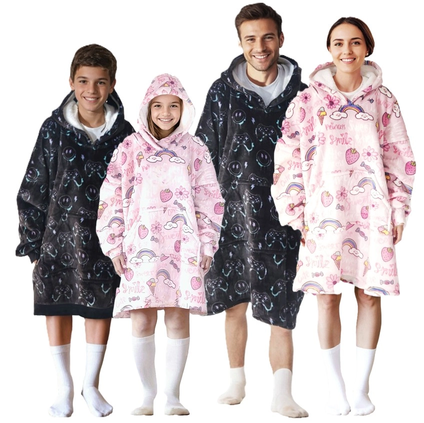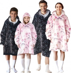 Praktyczne detale, takie jak duży kaptur i pojemna kieszeń kangurka, utrzymują głowę i dłonie w cieple. Koc-bluza ma uniwersalny dziecięcy rozmiar o długości do kolan i jest odpowiednia dla dzieci od 7 do 12 lat. Łatwa pielęgnacja w pralce ułatwia codzienne użytkowanie.