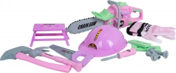 Różowy zestaw narzędzi do zabawy dla dzieci od 3 lat ucieszy małych majsterkowiczów bogatym wyposażeniem. Zawiera piłę łańcuchową z efektami dźwiękowymi, kask ochronny i rękawice, młotek, piłę, śrubokręt, śrubki oraz stolik – mini warsztat. Wykonany z wysokiej jakości plastiku, bezpieczny i lekki dla dziecięcych rąk.