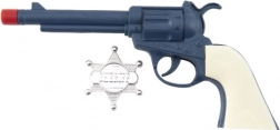 Zostań małym kowbojem! Ten plastikowy rewolwer z odznaką szeryfa ucieszy wszystkich małych rewolwerowców. Broń wydaje klapający dźwięk, w zestawie znajduje się także odznaka szeryfa oraz plakat „Wanted” dla jeszcze większej porcji zabawy. Idealna zabawka dla dzieci od 3 lat.