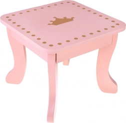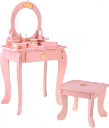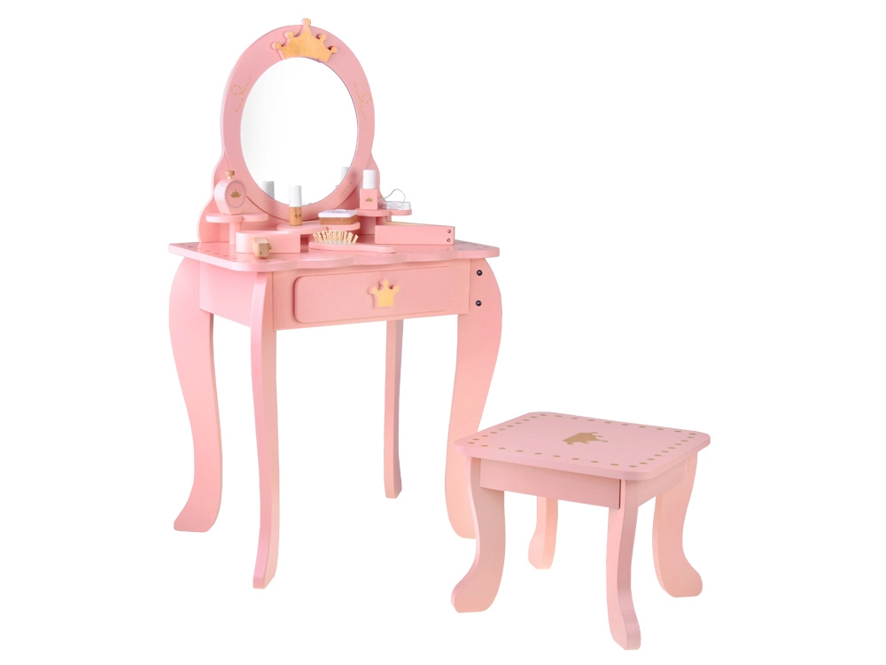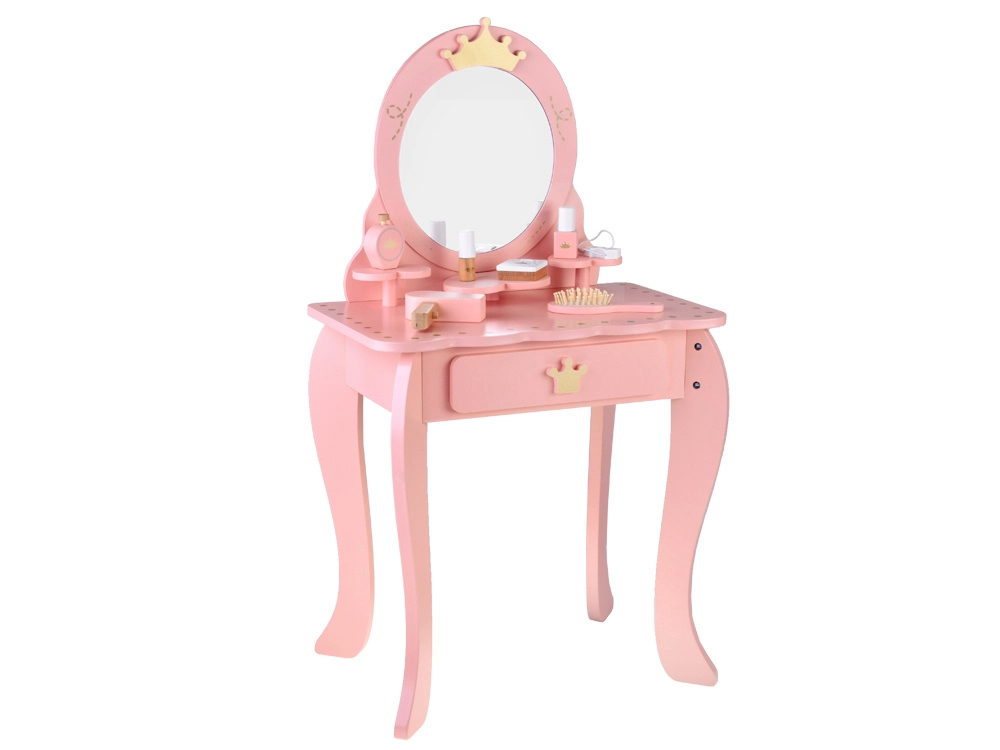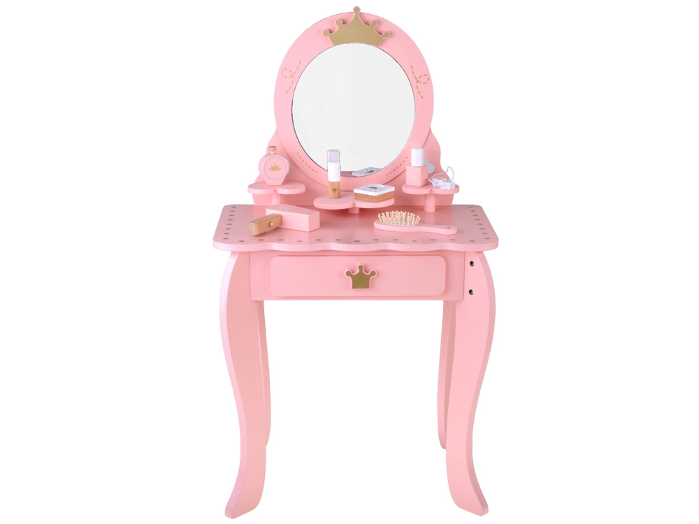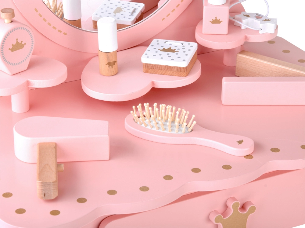 W zestawie znajduje się również wygodny stołeczek oraz liczne drewniane i plastikowe dodatki: szczotka, suszarka, prostownica do włosów, gumki, pomadka, cienie do oczu, perfumy, lakier do paznokci oraz trzy kubeczki w kształcie serca na drobiazgi. Subtelne połączenie różu, złota i srebrnych detali pięknie komponuje się z wystrojem pokoju dziecięcego.