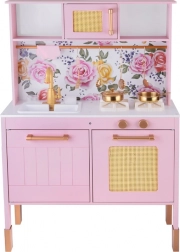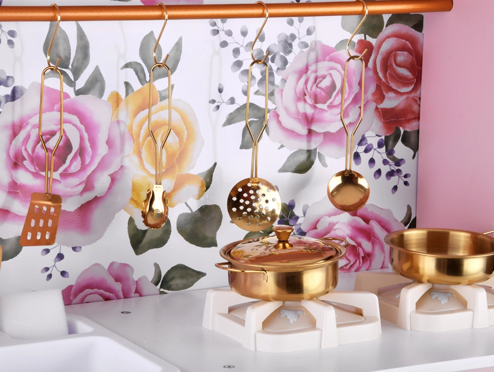 Ta retro drewniana kuchnia w delikatnym różowym kolorze łączy trwałe materiały z pięknymi detalami: złote uchwyty, kwiatowe tło i stabilne nóżki. Dzieci pokochają naśladowanie dorosłych dzięki świecącym palnikom z efektem gotowania i smażenia, obrotowym pokrętłom z klikaniem oraz zlewowi ze złotą baterią.
