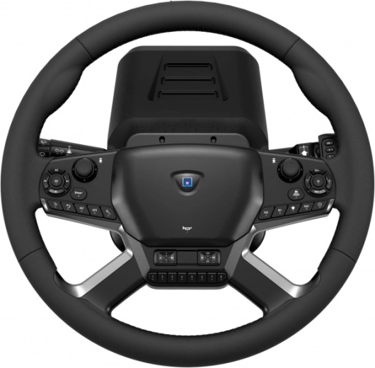 Kierownica o średnicy 40 cm z powierzchnią z ekoskóry i zakresem 1800° zapewnia autentyczne odczucia z prowadzenia ciężkich pojazdów zarówno na drodze, jak i na placu.