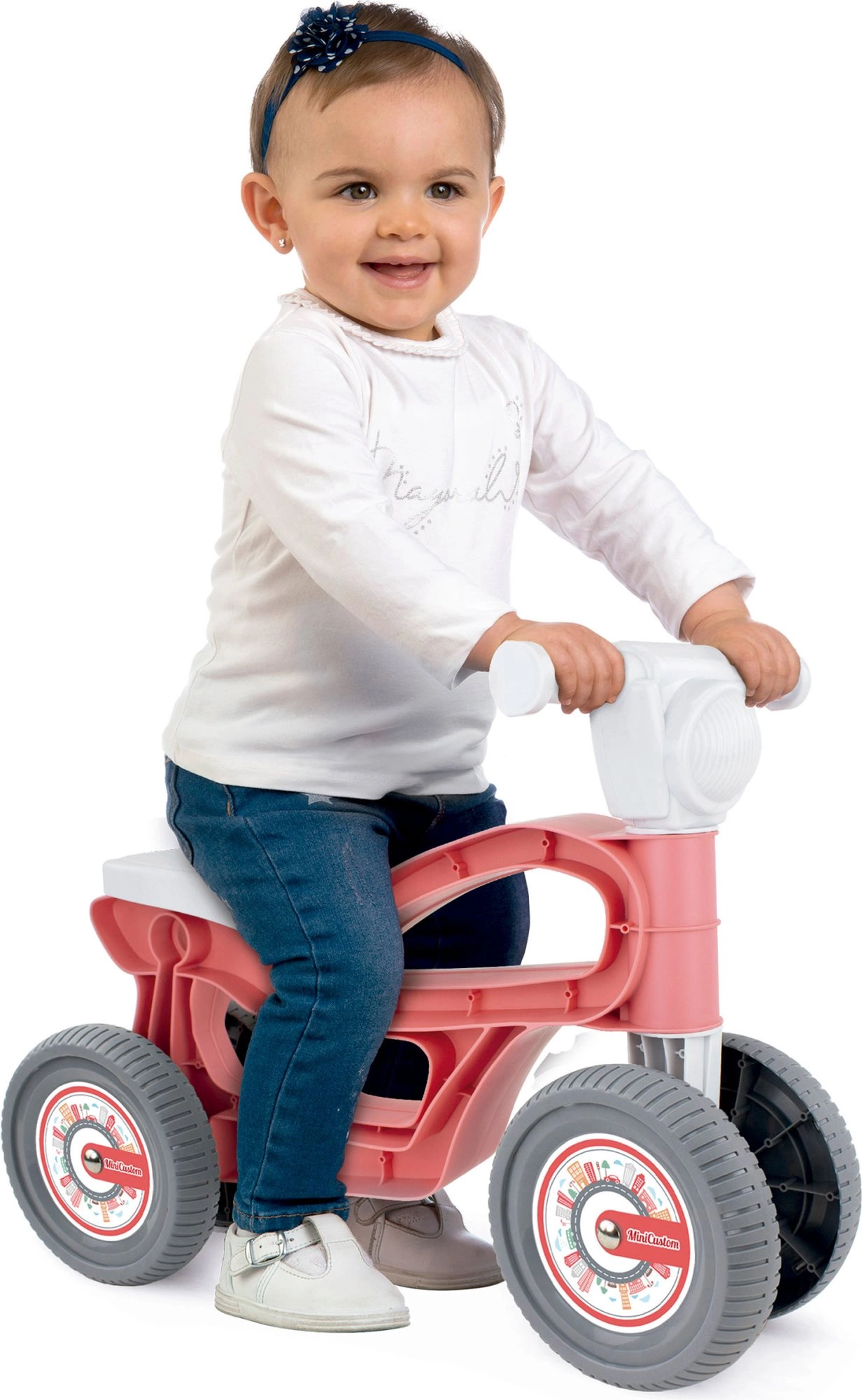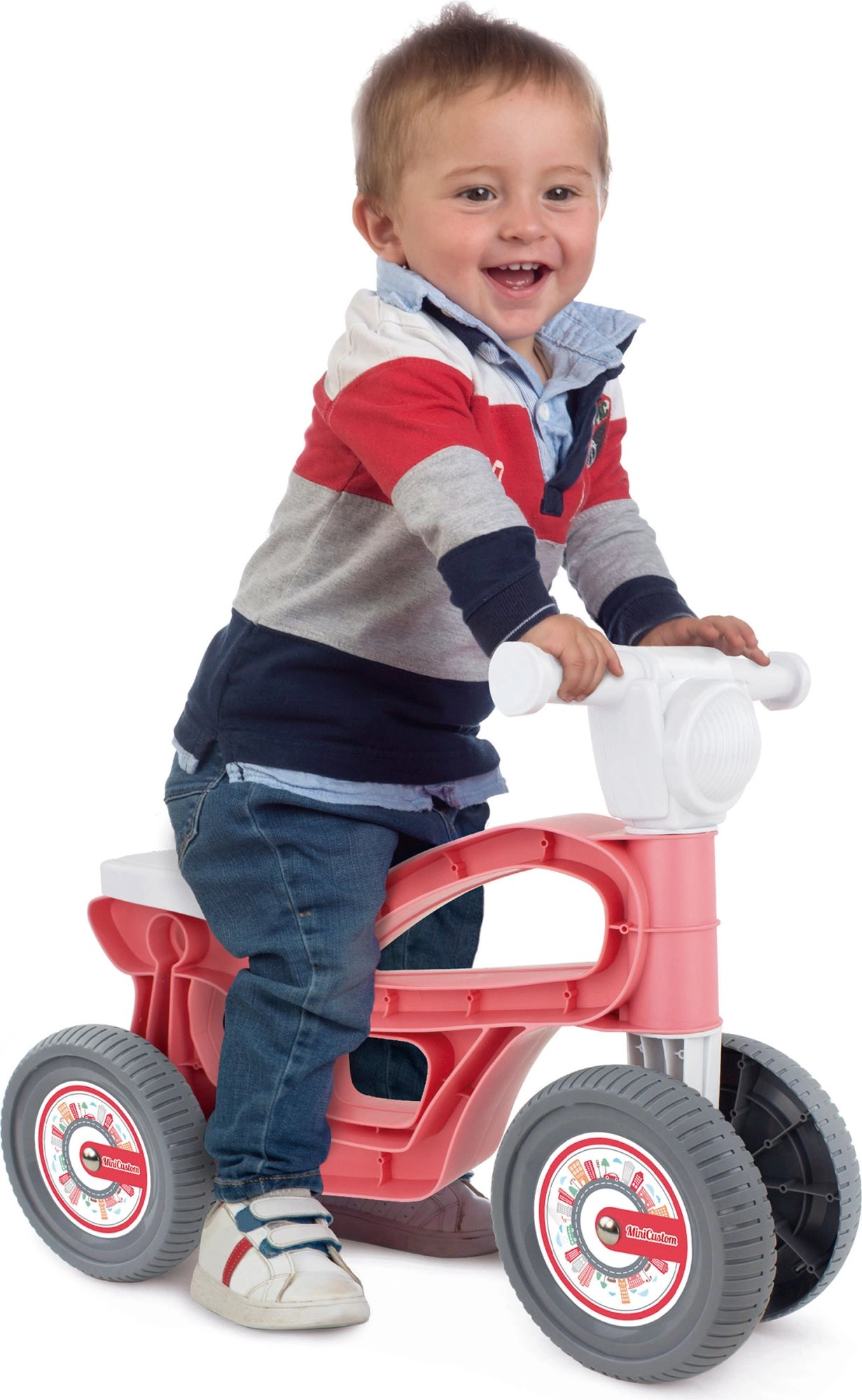 Stylowy motocykl–jeździk wspiera rozwój dużej motoryki i równowagi u dzieci od 10 do 36 miesięcy. Dzięki czterem kołom jest wyjątkowo stabilny, a jednocześnie lekki i łatwy w prowadzeniu. Koralowy kolor spodoba się małym kierowcom i ich rodzicom.