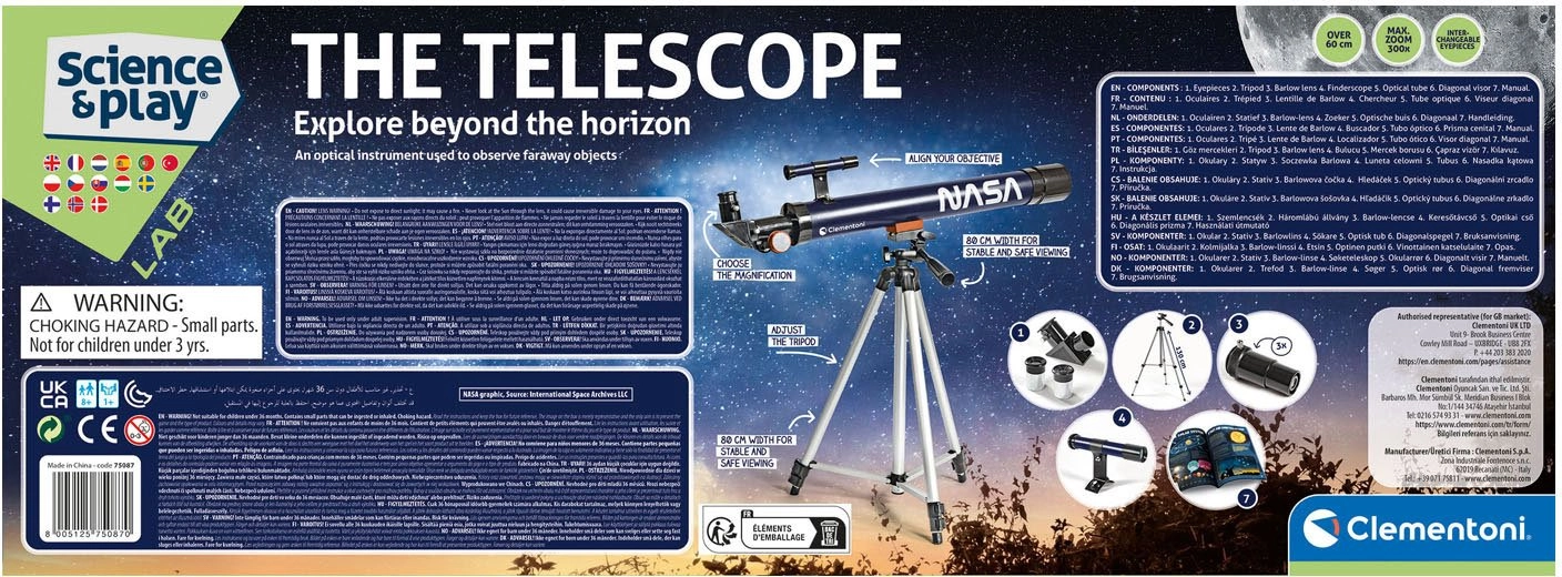 Dziecięcy teleskop CLEMENTONI Science & Play to doskonałe wprowadzenie do świata astronomii. Zapewnia jasny obraz dzięki obiektywowi o średnicy 50 mm oraz dwóm wymiennym okularom (6 mm i 12 mm), z którymi dzieci łatwo zbadają Księżyc, gwiazdy i podstawowe obiekty nocnego nieba. Inspiracja NASA oraz nacisk na edukację sprawiają, że to idealny wybór dla małych odkrywców.