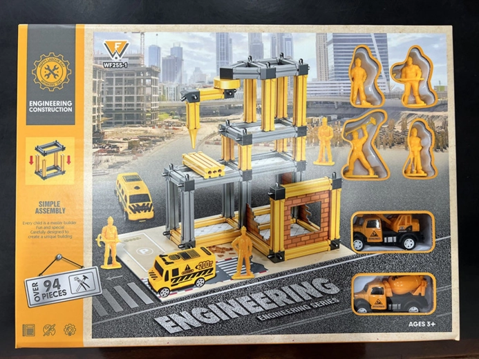 Zestaw wykonany jest z trwałych i bezpiecznych materiałów, odpowiedni dla dzieci od 3 lat. Zawiera wszystko, co potrzebne do natychmiastowej zabawy – od części do złożenia placu budowy, przez 4 figurki pracowników budowy, po 2 metalowe pojazdy budowlane z ruchomymi elementami (koparka i dźwig).