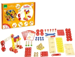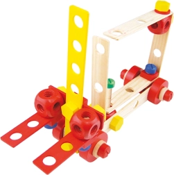 Kolorowe i naturalne listewki, śruby, nakrętki, koła i łączniki pozwalają dzieciom składać pojazdy oraz fantazyjne konstrukcje i wielokrotnie je przebudowywać.