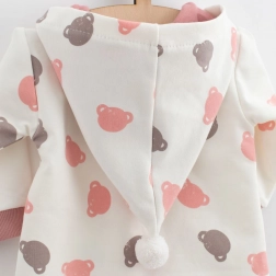 Uroczy design z misiami oraz kaptur z kolorową podszewką uzupełnia zabawny pompon. Elastyczne ściągacze przy rękawach i nogawkach utrzymują kombinezon na miejscu i chronią przed chłodem. Świetny wybór do domu i na spacery.