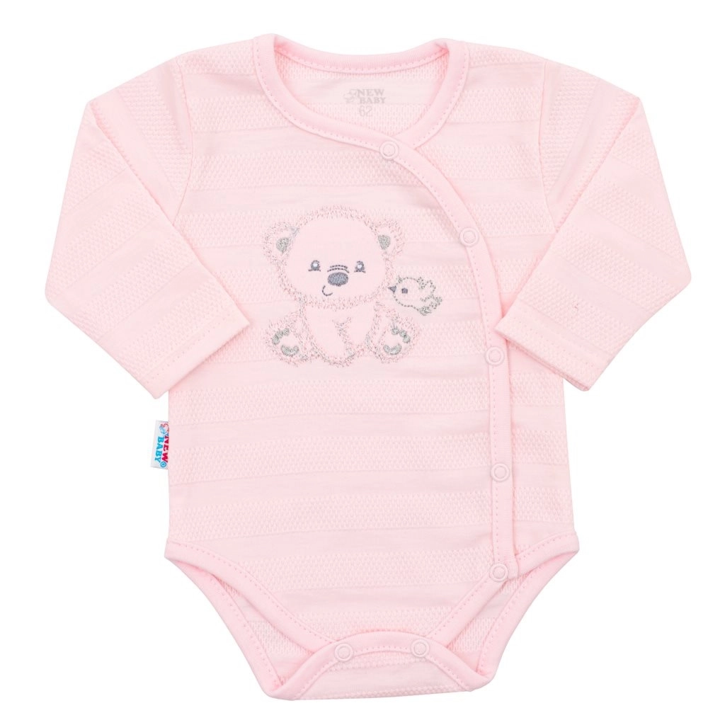 Zestaw niemowlęcy New Baby Sweet Bear w kolorze różowym zapewnia wygodę, funkcjonalność i delikatny design w pierwszych miesiącach życia maluszka. Body zapinane na całej długości z długim rękawem oraz śpiochy z napami na ramiączkach i w kroku ułatwiają przebieranie i przewijanie. Kaftanik jest jednokolorowy z subtelną lamówką i zapięciem na całej długości, czapeczka wiązana na sznureczki świetnie zakrywa uszka.
