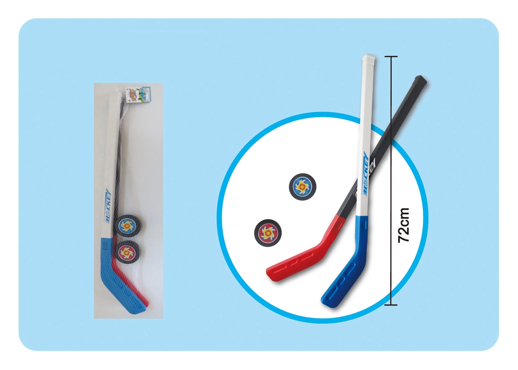 Zabawny zestaw hokejowy w siateczce dla małych sportowców. Opakowanie zawiera dwie kije hokejowe i dwa krążki, idealne do treningu w domu i zabawy w ogrodzie. Niewskazane dla dzieci poniżej 3 lat.
