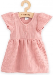 Leciutka i mięciutka dziecięca muślinowa sukienka New Baby w kolorze różowym jest idealna na lato. Oferuje oddychający i delikatny materiał ze 100% bawełny, krój w literę A z krótkim rękawem oraz łatwe zapięcie z przodu dla wygodnego ubierania. Certyfikat OEKO-TEX STANDARD 100 gwarantuje bezpieczeństwo dla wrażliwej dziecięcej skóry.