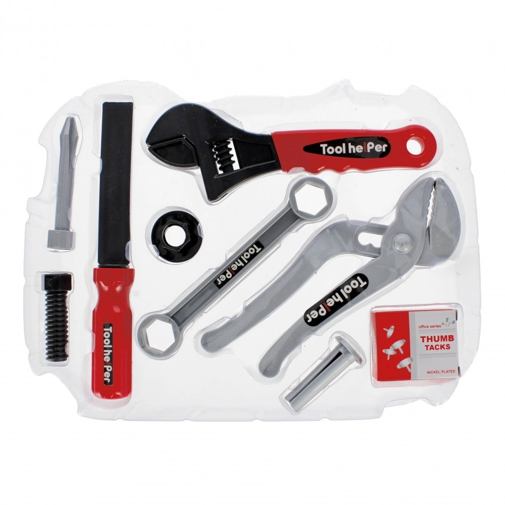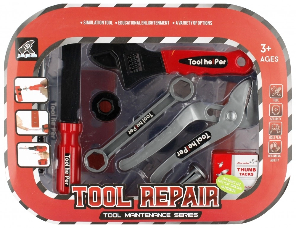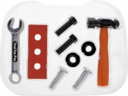 W zestawie znajdują się imitacje narzędzi, takie jak młotek, klucze czy śruby, które swoim wykonaniem zachęcają do samodzielnej zabawy i naśladowania dorosłych. Świetne do domowego warsztaciku, wspólnej zabawy i rozwijania wyobraźni.