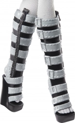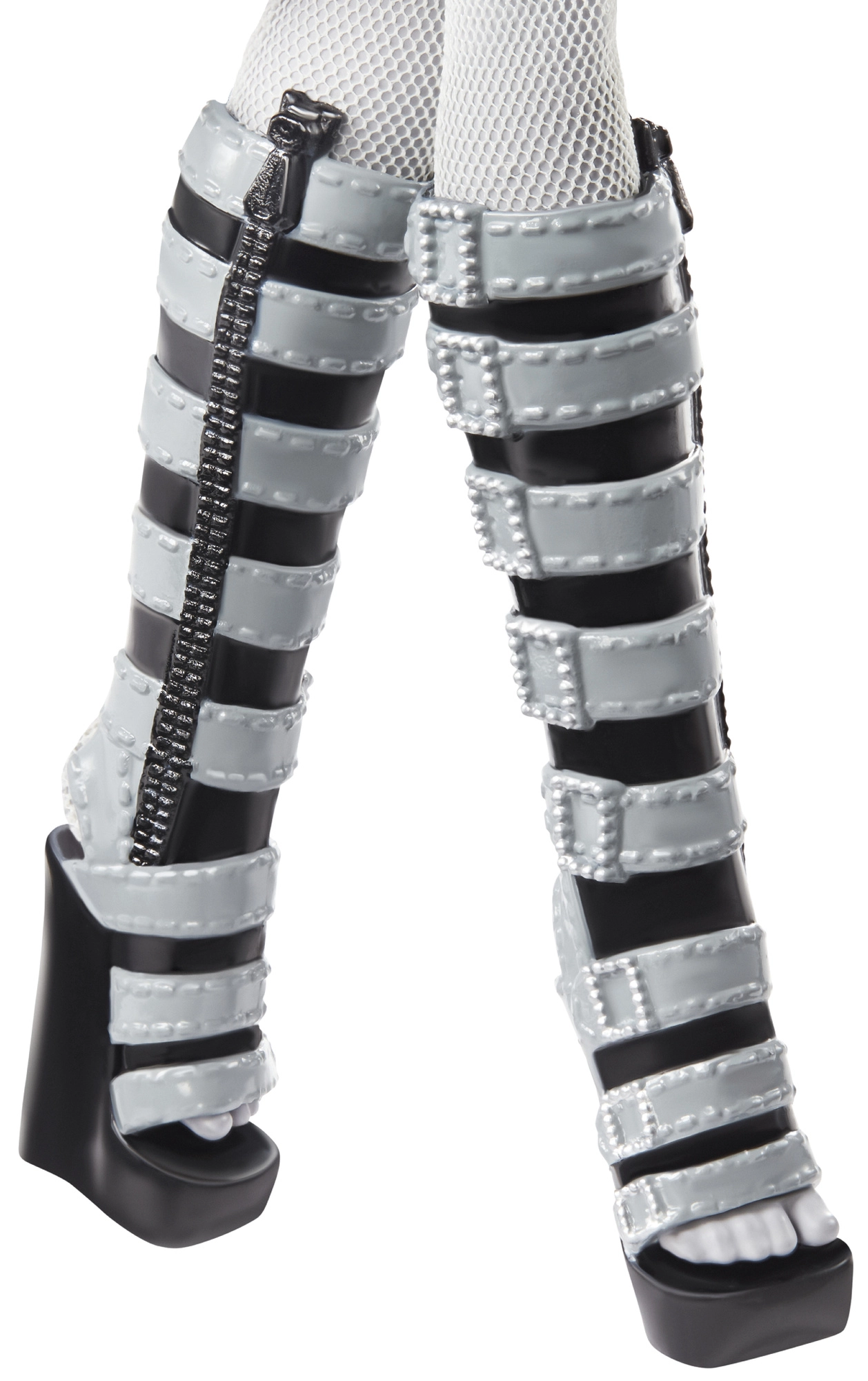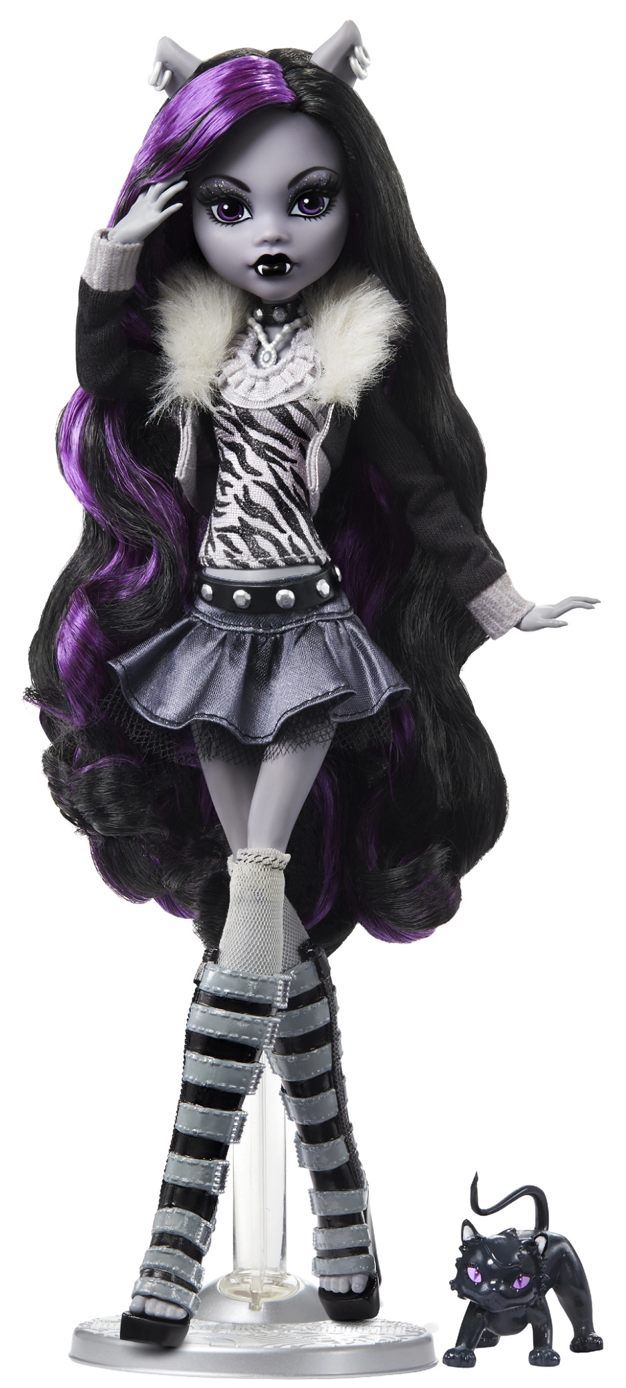 Odkryj wyjątkowy design edycji Reel Drama: Clawdeen Wolf lśni w monochromatycznej stylizacji z kontrastującymi fioletowymi akcentami. Szczegółowo wykonany strój z miękką „puszystą” kurteczką, rozkloszowaną spódnicą i platformowymi sandałami podkreśla jej drapieżny charakter. Dzięki przegubom artykułowanym z łatwością ustawisz ją w ikonicznych pozach do witryny i zdjęć.