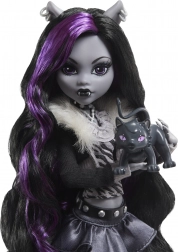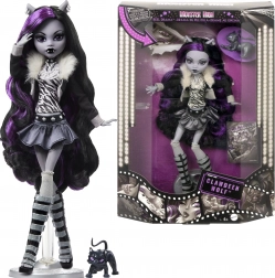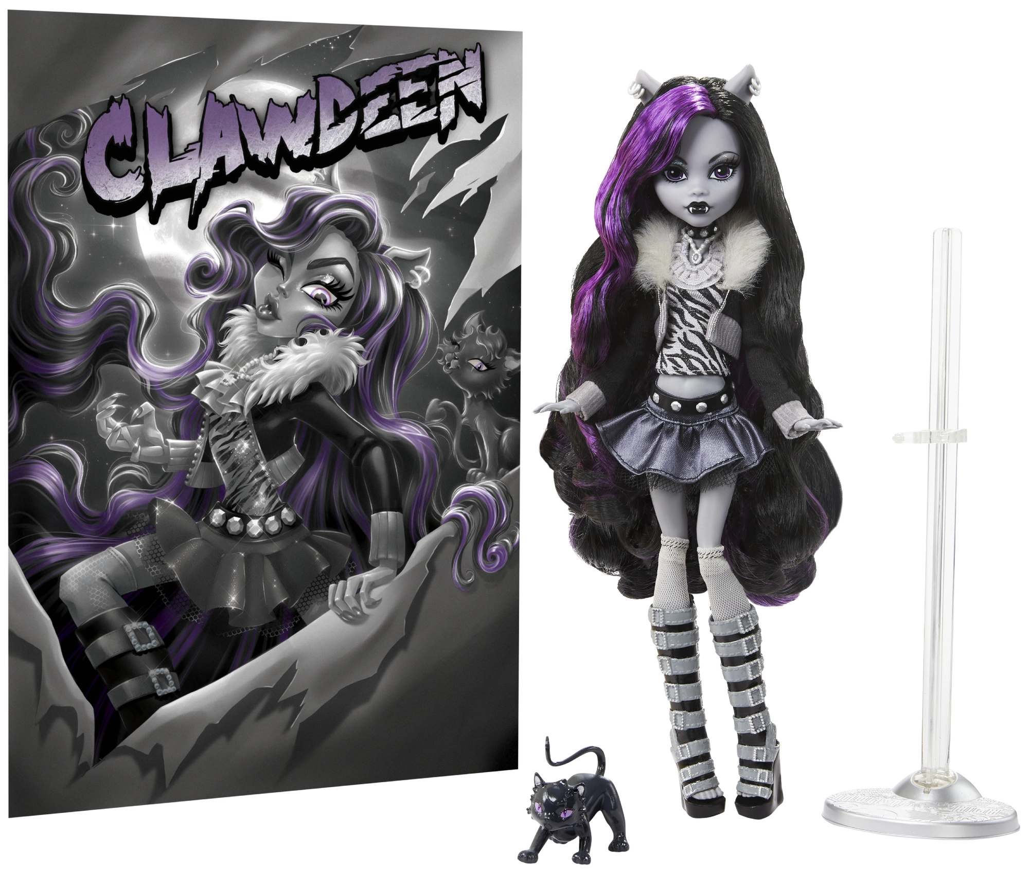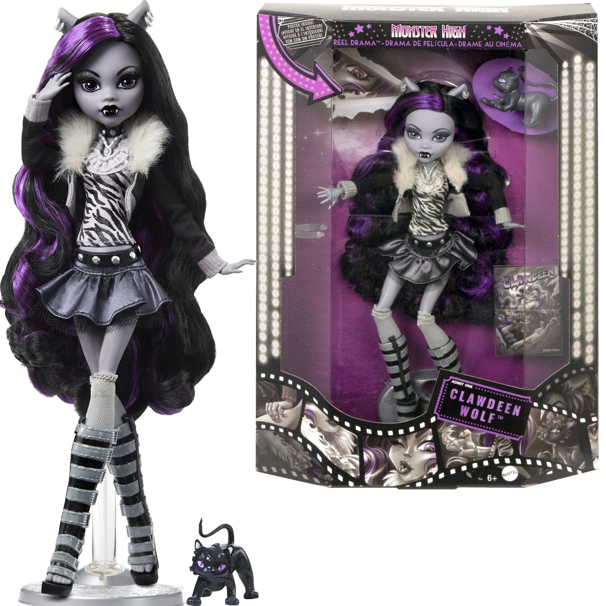 Stylowa kolekcjonerska lalka MONSTER HIGH Clawdeen Wolf z edycji Reel Drama składa hołd czarno‑białym horrorom i ikonicznemu stylowi serii. Ma ok. 26 cm wysokości, w pełni przegubowe ciało do kreatywnego pozowania oraz wyraziste czarno‑fioletowe włosy. W zestawie elegancki retro strój, stojak i urocze zwierzątko – idealna do zabawy i ekspozycji.