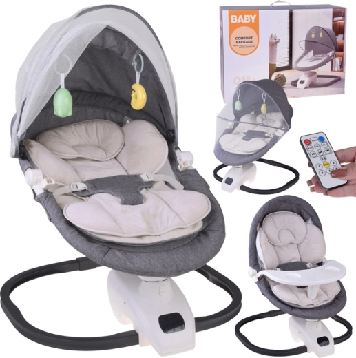 Zintegrowany panel z muzyką i pilot umożliwiają ustawienie intensywności bujania, głośności, przełączanie kołysanek oraz użycie timera (np. 8/15/30 min). Regulowany daszek z zabawkami zacienia przed światłem, a delikatna moskitiera chroni przed owadami. Pokrowiec łatwo zdjąć i wyprać, konstrukcja jest stabilna i bezpieczna.