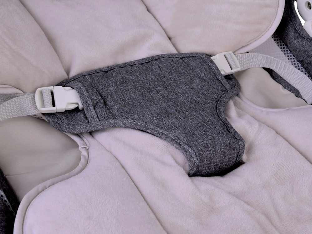 Miękkie, wyściełane siedzisko z wkładką i regulowanym oparciem utrzymuje dziecko w ergonomicznej pozycji. Pięciopunktowe pasy i stabilna podstawa gwarantują pewność podczas odpoczynku i bujania.