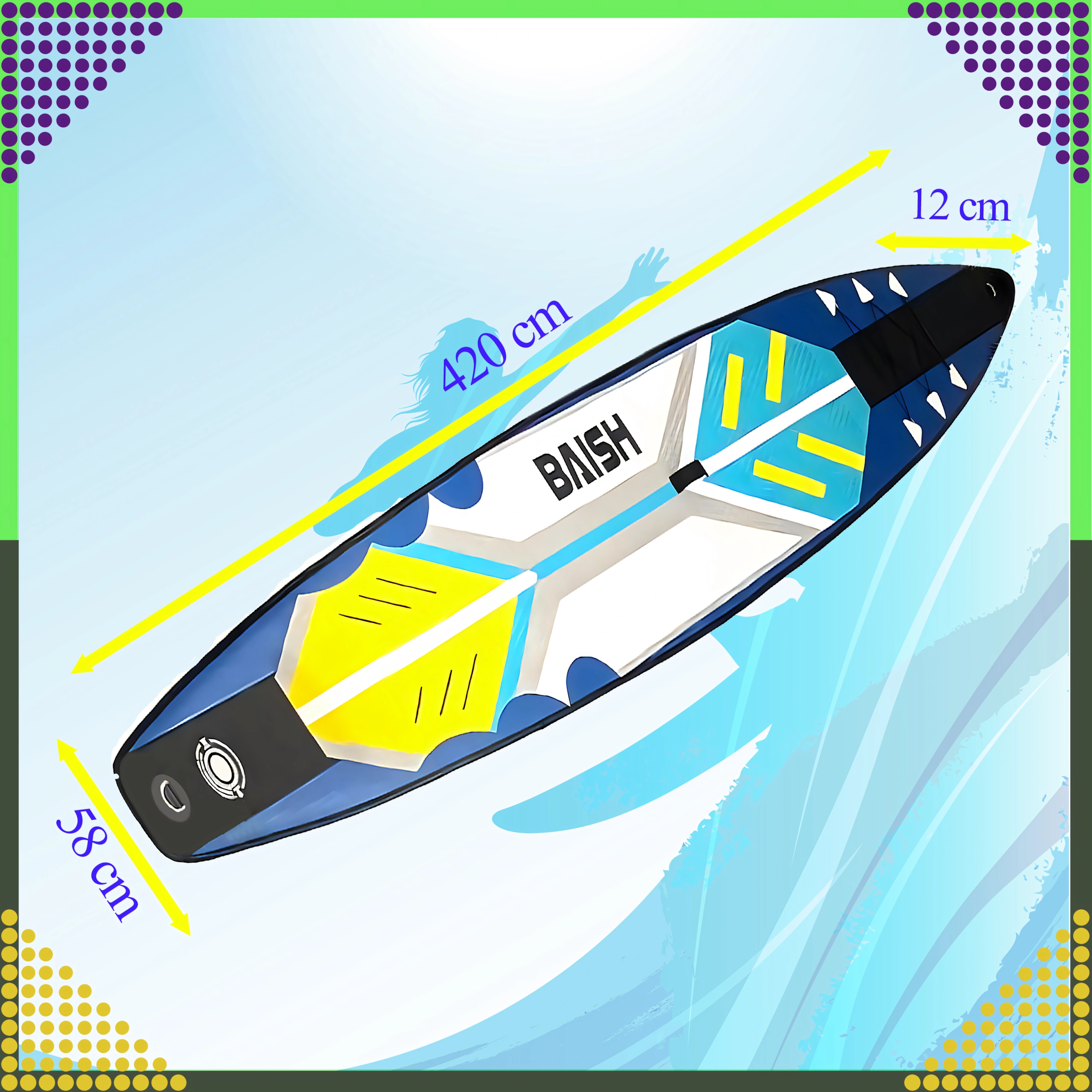 Odkryj wolność na wodzie z nadmuchiwaną deską SUP o wymiarach 420 × 58 × 12 cm, która oferuje wysoką stabilność, łatwe manewrowanie oraz komfortową, antypoślizgową powierzchnię EVA. Dzięki wytrzymałej konstrukcji kompozytowej z PVC wzmocnionym włóknem szklanym, zaworowi wysokociśnieniowemu i niskiej masie jest idealna na długie wycieczki i rekreacyjne pływanie. W zestawie praktyczne akcesoria dla wygodnego użytkowania.