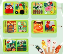 Dzieci poznają zwierzęta gospodarskie, kolory, kształty i rośliny uprawne. Przenosząc elementy, tworzą własne scenki i rozwijają słownictwo oraz wyobraźnię.