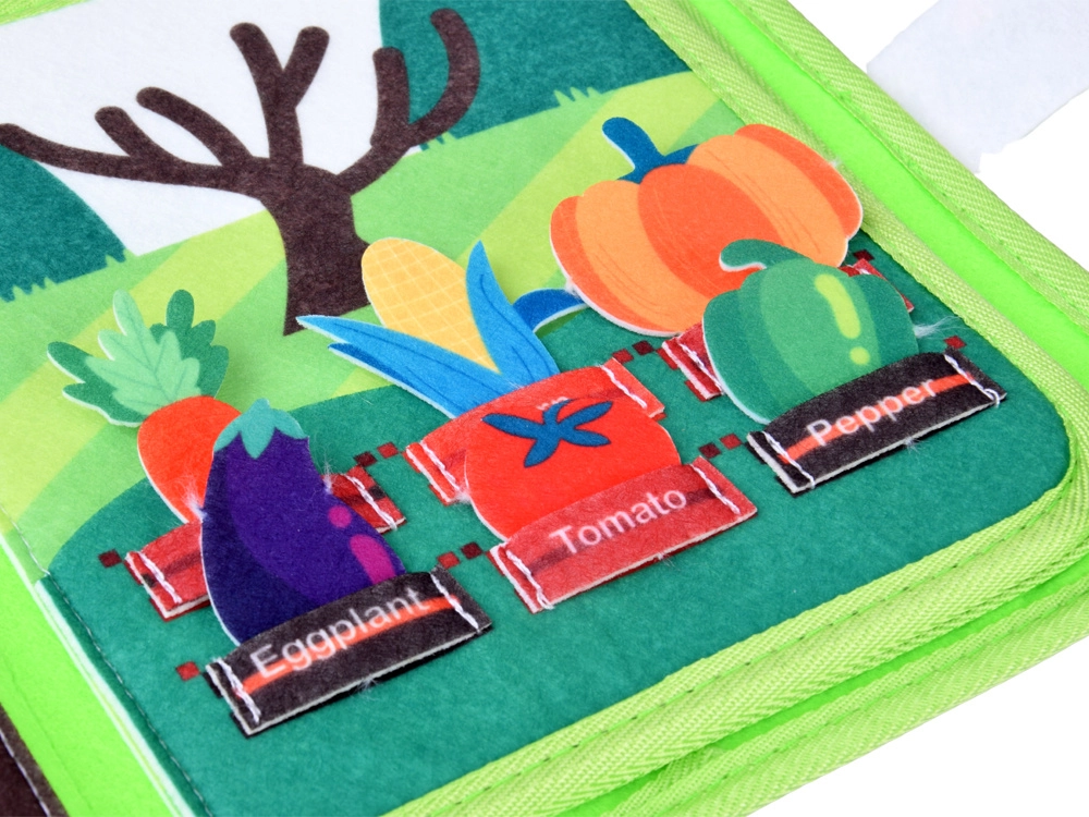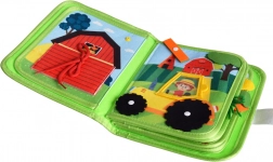 Ta tekstylna sensoryczna książeczka o tematyce farmy zapewnia dzieciom godziny twórczej zabawy. Na każdej stronie czekają zwierzątka, warzywa, traktor i stodoła, które można przemieszczać i łączyć dzięki rzepom. Dzieci mogą podnosić okienka, obracać koła traktora, wiązać sznurowadło i odkrywać, co kryje się na farmie.