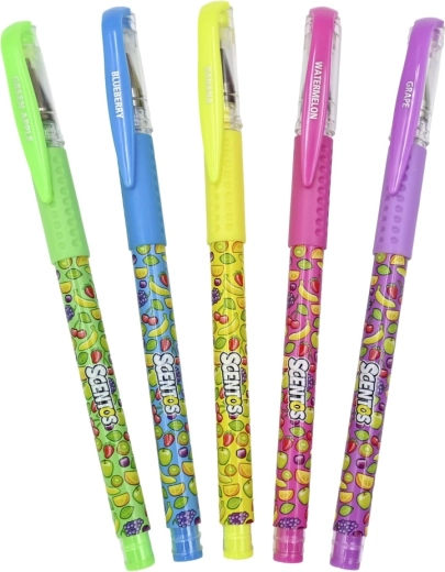 W opakowaniu znajdziesz pięć zapachów i kolorów: zielony (green apple), niebieski (blueberry), żółty (banana), różowy (watermelon) i fioletowy (grape). Długopisy wykonane są z nietoksycznych materiałów i spełniają wymagania dotyczące bezpiecznych artykułów szkolnych.
