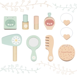 - drewniana toaletka, drewniane krzesełko, suszarka, lusterko, grzebień, cienie do powiek, szminka, buteleczka „perfum”, puder, tusz do rzęs, 2 gumki do włosów