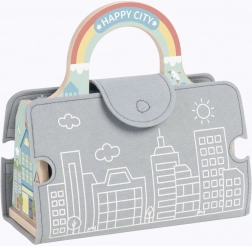 Ten kreatywny drewniany zestaw zamieni każdy stół w tętniące życiem miasto. Filcowe drogi łatwo składają się w różne trasy, mały samochodzik przejedzie przez bramę miejską, obok sygnalizacji świetlnej i znaków drogowych. Przenośna konstrukcja w formie torby pozwala zabrać całe miasto w podróż – do dziadków i na wakacje.